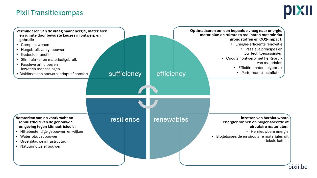 Het Pixii transitiekompas SER² is onze strategie voor koolstofneutraal, circulair en klimaatrobuust bouwen. We vertrekken van de principes van het SER-framework (Sufficiency, Efficiency, Renewables) en voegen hier Resilience als vierde dimensie aan toe.